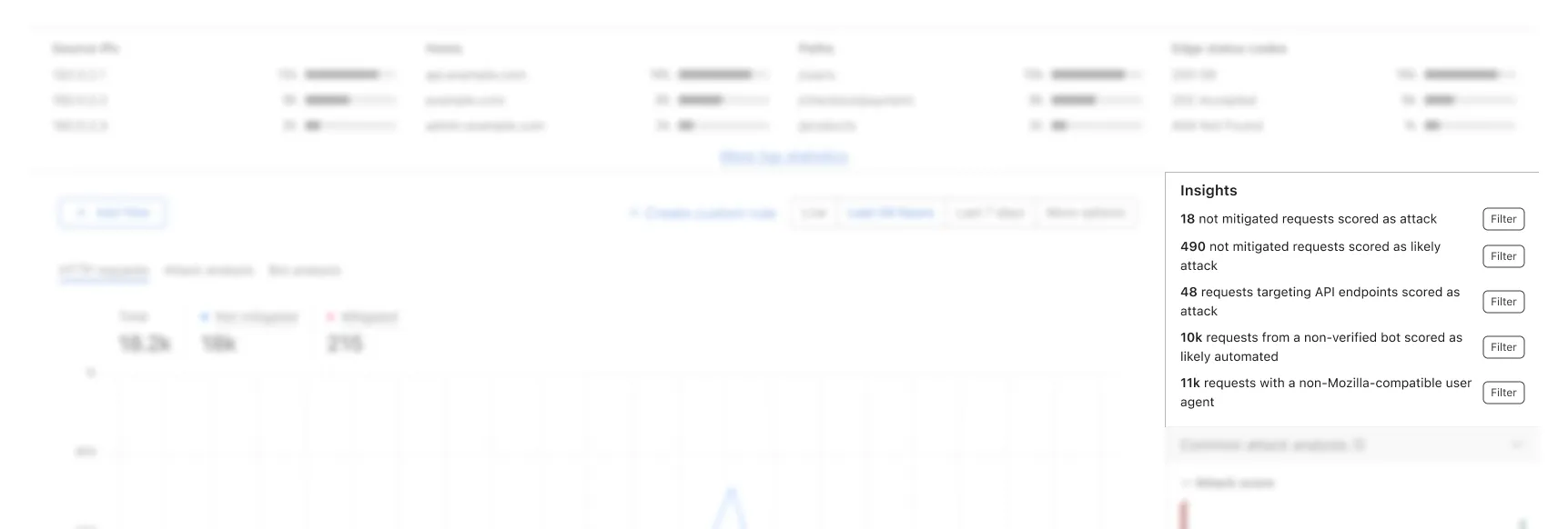 As mentioned above, besides like application focus as a starting point, a combination of different perspectives allows users to pick out anomalies that requires attention. With the introduction of the new intelligence and internal knowledge of common attack vectors, a new widget was created within a day that wasn’t part of the original proposal, but solely based on the internal testings. This new widget is named “Insights”, sitting higher up above the fold, highlighting requests counts of hand crafted combinations of filters. With this addition, we invited few more internal testers to validate this assumption and the outcome was positive.