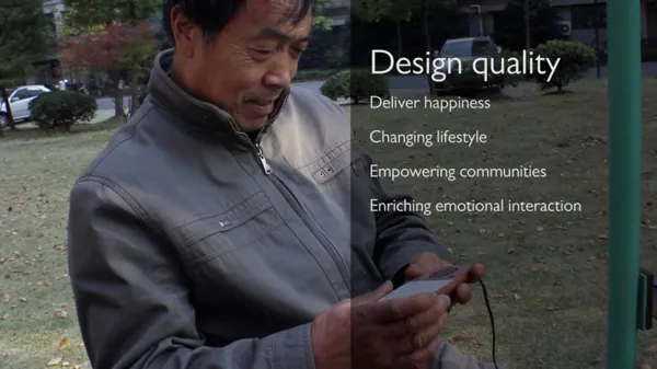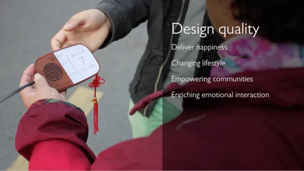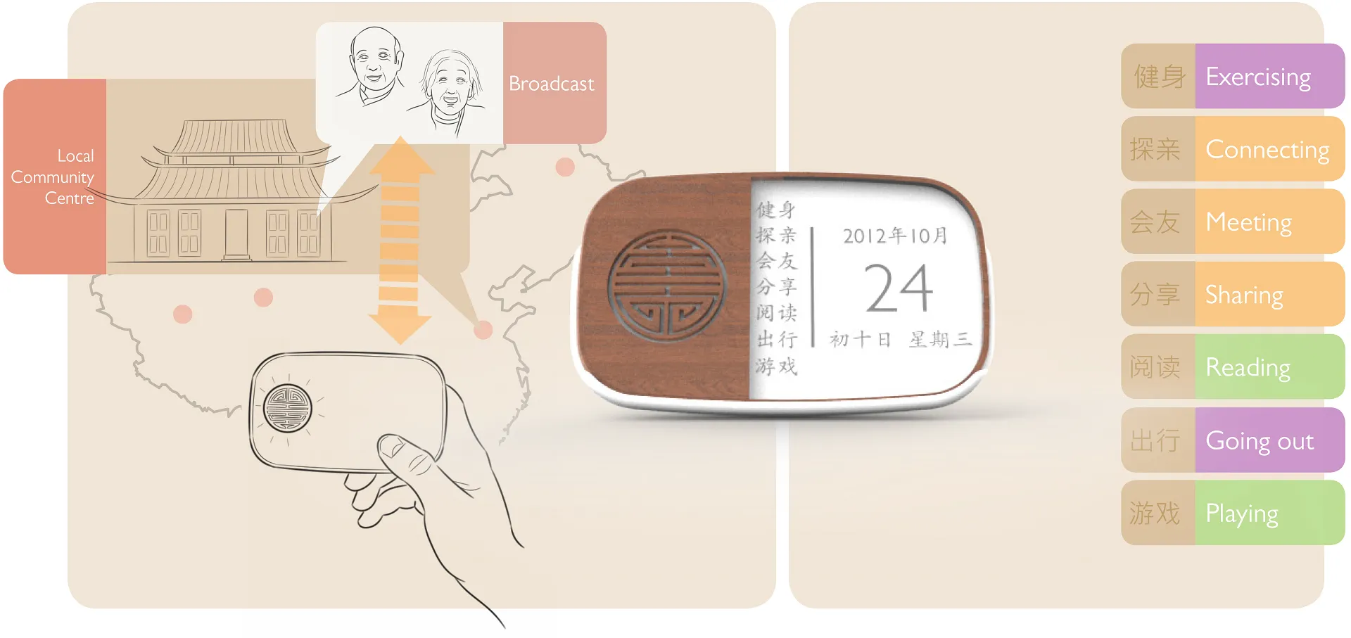 HappyLongLiving is a product-service system designed for Chinese market, which aims to motivate elders to engage more with local communities as well as to boost their physical activeness. By using a unique almanac and a local-organized radio, the device helps maintain elders’ mental well-being.